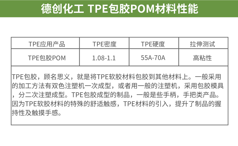 3.絕大多數(shù)情況下都是和硬膠進(jìn)行包膠成型的,包膠的機(jī)理是硬膠與軟膠能實現(xiàn)結(jié)合面的熔接,硬膠與軟膠的極性應(yīng)比較接近。因此,硬膠的種類不同,所采用的TPE物性及牌號也不同。一般來說特殊極性和表面特性的材料,均需要特殊的TPE配混料來包膠。